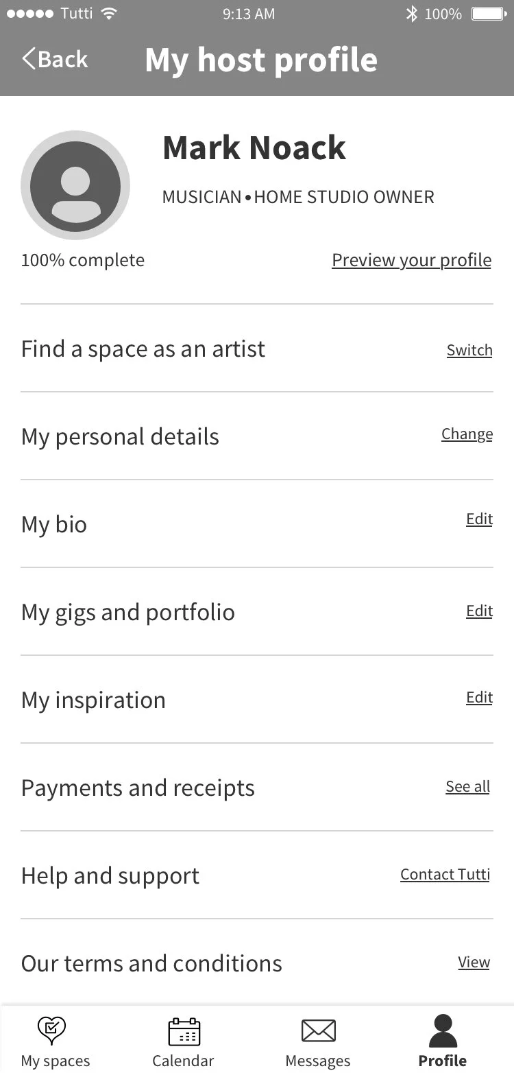 Tutti.space wanted to build a native app that will work along with the existing site. The client was seeking to increase conversion and increase retention. We needed to cater for two distinct groups of users: Hosts and Artists.