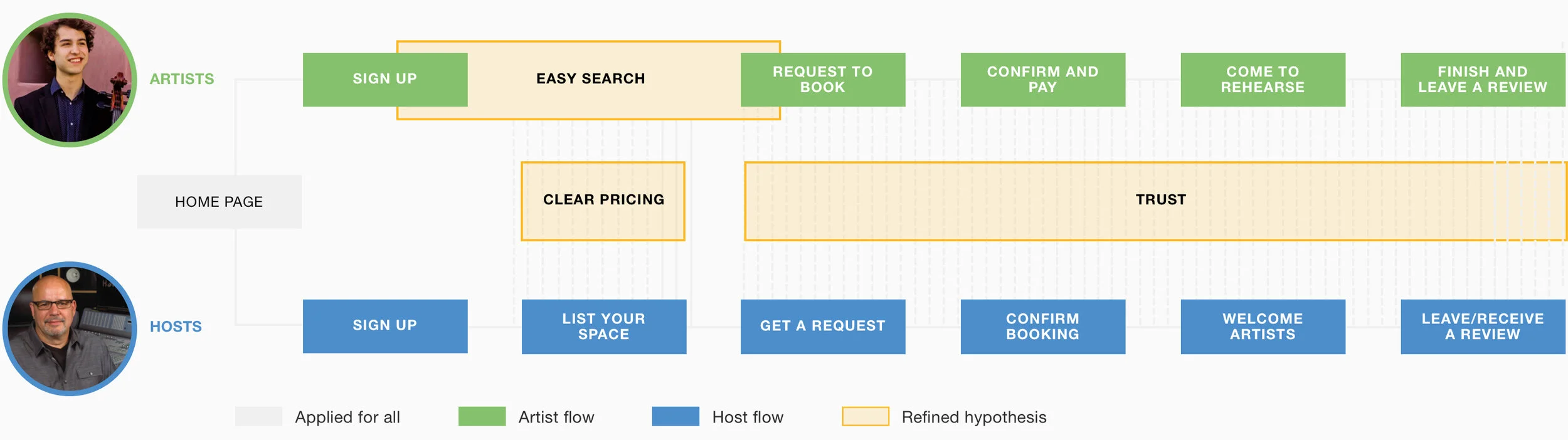 We added user research to the process and designed a cohesive experience, including multiple scenarios for two user groups: Hosts and Artists. We focused on eliminating three key areas of friction: trust, pricing, search.